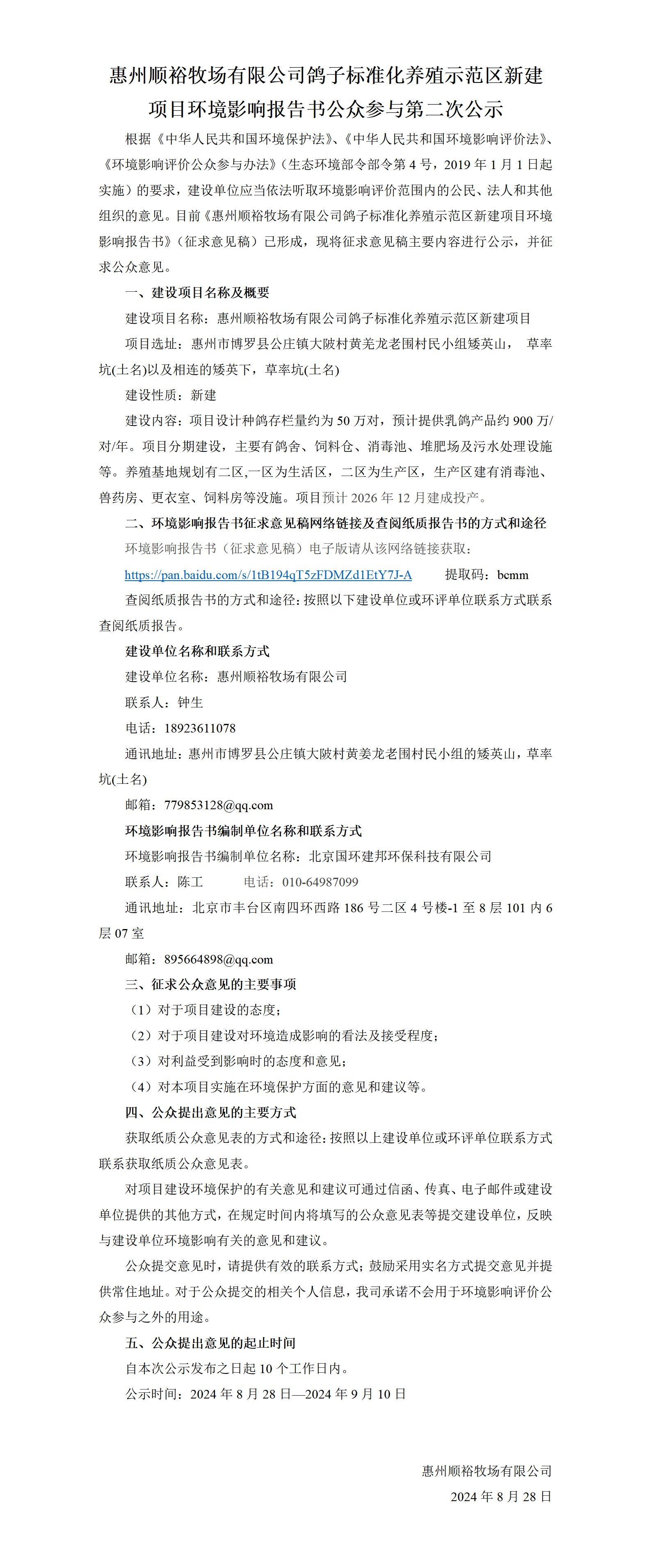 惠州順裕牧場有限公司鴿子標準化養殖示范區新建項目公眾參與第二次公示