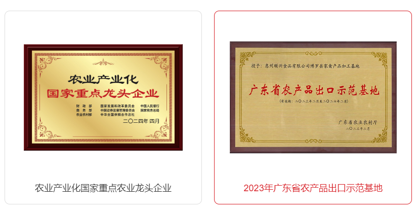 唐順興以其卓越的品質和廣泛的市場覆蓋,成為了行業內的佼佼者。公司通過了CIQ認證,養殖基地被國家農業部認定為畜禽養殖標準化示范場、廣東省現代化美麗牧場等多項榮譽稱號。唐順興的乳鴿等標桿產品已獲廣東省名牌產品、無公害農產品、粵字號農產品認定,品質有保障。此外,“唐順興”商標還榮獲廣東省著名商標稱號,品牌影響力不斷提升。