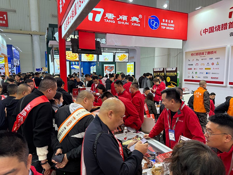 作為集家禽養殖、生產加工、冷鏈物流于一體的全產業鏈企業,唐順興實現了從“農場到餐桌”的多品類產品全鏈條布局。展會上唐順興自主研發的港式沙田脆皮乳鴿、東江鹽焗雞、港式蜜汁叉燒、蒜香燒雞、港式脆皮燒鴨、港式脆皮燒鵝等大單品,吸引了眾多專業觀眾駐足品鑒。展位還特設了“港式燒臘品鑒區”,由資深粵菜師傅現場烹飪,風味贏得了大家的一致好評,“不愧是國民乳鴿”“口感媲美現制”等贊譽不斷!展位上人流如織!